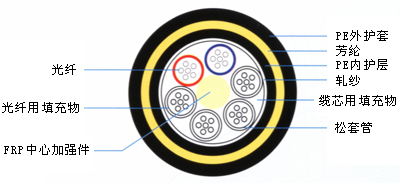 產品特點 ADSS型光纜是由5-12根松套管(或部分填充繩)繞中心非金屬加強構件(FRP)絞合成圓整纜芯,纜芯外擠上PE內護套后再絞繞一定數量起增強作用的芳綸紗,最后擠上PE外護套,本光纜全截面阻水,具有低損耗、低色散、適用于高壓輸電線路電力通信系統的需要.