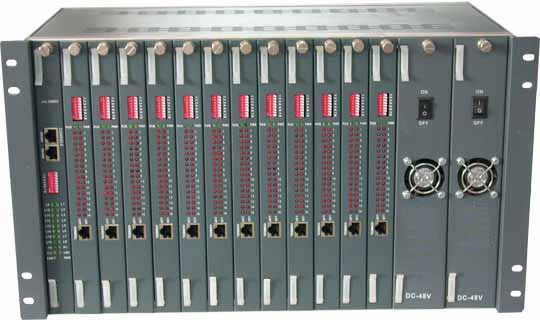 功能介紹:1個SNMP網管卡槽位、12個業務卡槽位,支持12個光方向,可混插入4E1/8E1/16E1  PDH光端機、E+E光端機、HS-CON204/HS-CON208協轉等業務卡,每塊卡獨立工作。支持電源雙備份,有2個電源板槽位。