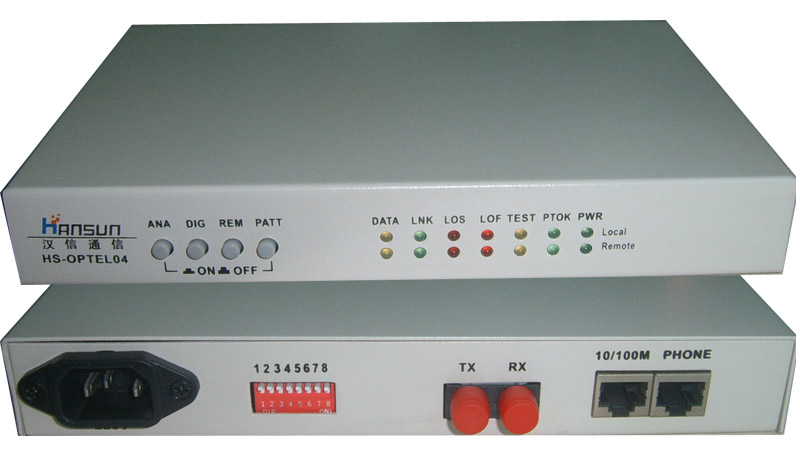 HS-OPTel系列 4路電話光端機是在超大規模集成電路的基礎上開發的點對點語音光傳輸設備,它以簡潔的形式實現了1路10/100M以太網數據通道,加上4路語音通道(FXO、FXS),光復用傳輸設備。具告警監控,功能完善,集成度高,功耗低,性能穩定,使用方便。