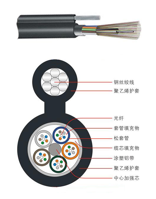 漢信 GYTC8A 光纜的結構是將 250μm 光纖套入高模量材料制成的松套管中,松套管內填充防水化合物。纜芯的中心是一根金屬加強芯,松套管(和填充繩)圍繞中心加強芯絞合成緊湊和圓形的纜芯,纜芯用一層涂塑鋁帶(APL)縱包后,和鋼絲絞線集成到一個8字型的聚乙烯護套內。