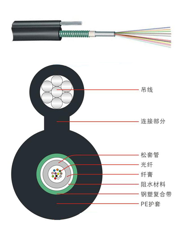 漢信 GYXTC8S光纜的結構是將 250μm 光纖套入高模量材料制成的松套管中,松套管內填充防水化合物。松套管外用一層雙面涂塑鋼帶(PSP)縱包,鋼帶和松套管之間加阻水材料以保證光纜的緊湊和縱向阻水,和鋼絲絞線集成到一個8字型的聚乙烯護套內。