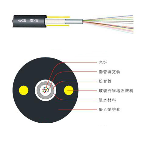 漢信GYFXY 光纜的結構是將 250μm 光纖套入高模量材料制成的松套管中,松套管內填充防水化合物。松套管外加阻水材料以保證光纜縱向阻水,兩側放置兩根平行玻璃纖維增強塑料(FRP)后擠制聚乙烯護套成纜。