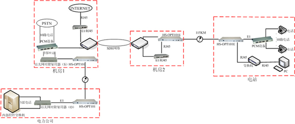 該方案采用我公司生產的PDH光端機、PCM設備、以太網時隙復用器,協議轉換器.實現了電力公司內部電話和外部電話的延長,同時解決了以太網的接入和監控數據的傳輸!