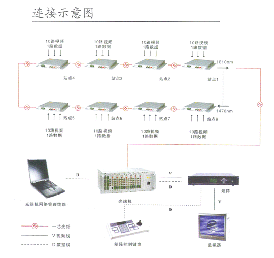 由于高速公路各個收費站之間距離監控中心比較遠,而且全線監控需要上傳的圖象也比較多,所以采用漢信系列光端機通過接點級連的方式進行圖象數據傳輸。